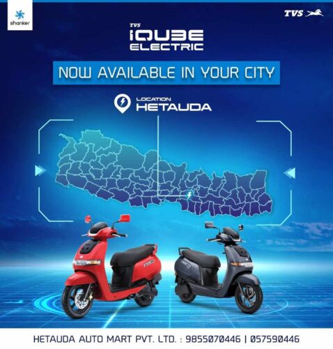 हेटौंडा । टिभिएसको नेपालका लागि आधिकारिक बितरक जगदम्बा मोटर्स प्रा.लि.ले इलेक्ट्रिक स्कुटर आईक्युब हेटौंडामा उपलब्ध गराएको छ ।