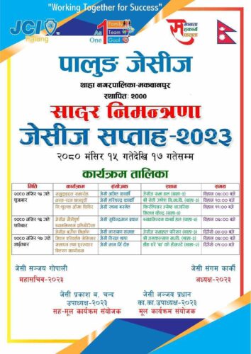 कोषाध्यक्ष कार्कीका अनुसार मंसिर १५ गते तीन कार्यक्रम हुनेछन् । बिहान ७ बजे जेसीज हलमा जेसीज सप्ताह कार्यक्रमको उद्घाटन कार्यक्रम अजित कार्कीको संयोजकत्वमा हुनेछ ।