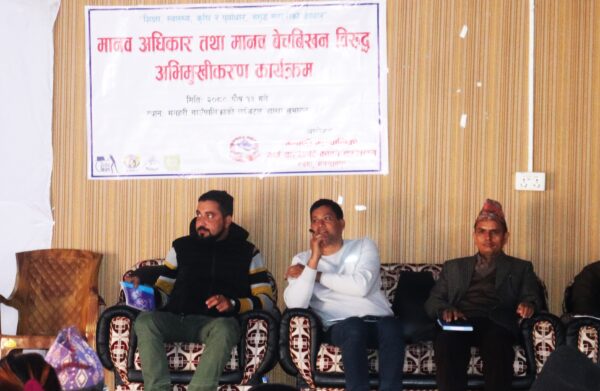 कार्यक्रममा गाउँपालिकाका प्रमुख प्रशासकीय अधिकृत रमेश सुवेदीले मानव बेचविखन तथा मानव अधिकार हनन् सम्बन्धी अपराध गम्भिर प्रकृतीको अपराध रहेको जिकिर गर्नुभयो ।